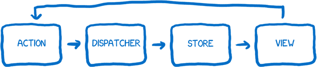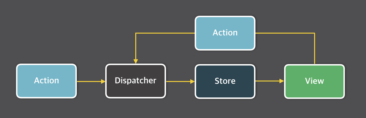 사용자의 입력을 기반으로 Action을 만들고, Action을 Dispatcher에 전달하여 Store의 데이터를 변경한 뒤 View에 반영하게 된다.