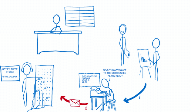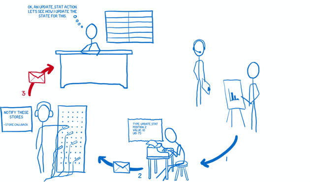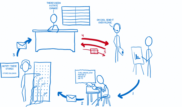 내가 Flux를 이해할 때 도움이 된 것은 이런 다이어그램이 아니라, 시스템을 잘게 나누어 함께 일하는 여러 캐릭터로 생각하는 것이었다.