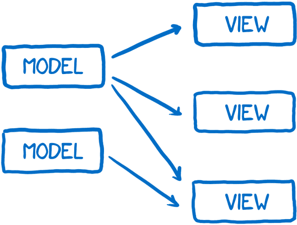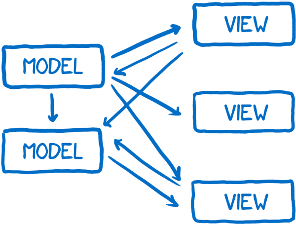 사용자와의 상호작용(userr interaction)이 뷰(view)를 통해서 일어났기 때문에 사용자의 입력에 따라 뷰가 가끔식 모델을 업데이트해야할 필요가 있었다. 그리고, [의존성(dependency) 때문에] 모델이 다른 모델을 업데이트해야할 때도 있었다.