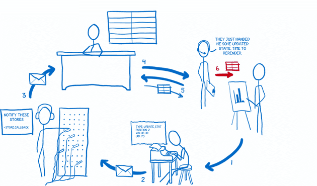 6. 스토어가 새로운 상태를 넘겨주면, 컨트롤러 뷰는 자신 아래의 모든 뷰에게 새로운 상태에 맞게 렌더링하라고 알린다.