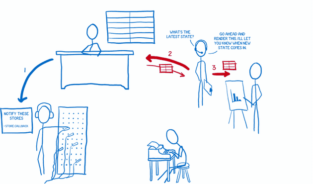상태가 변경되었을 때 스토어가 그 사실을 컨트롤러 뷰에게 알려주면, 컨트롤러 뷰는 자신의 아래에 있는 모든 뷰에게 새로운 상태를 넘겨준다.
