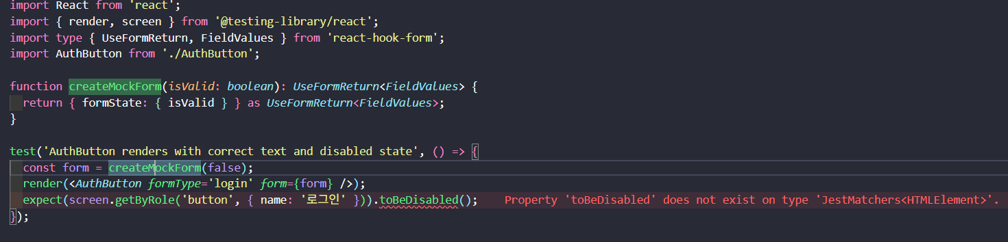 jest를 jest-dom 라이브러리를 써서 확장시키면 custom matcher를 제공해준다 적혀있고, 이 이유 때문에 setup을 해서 확장시키고 시작하는구나!라는걸 알게되서 setup 파일 만드니 바로 해결이 되었음