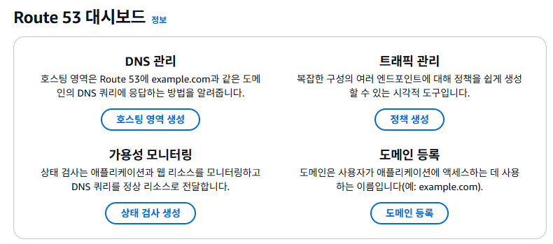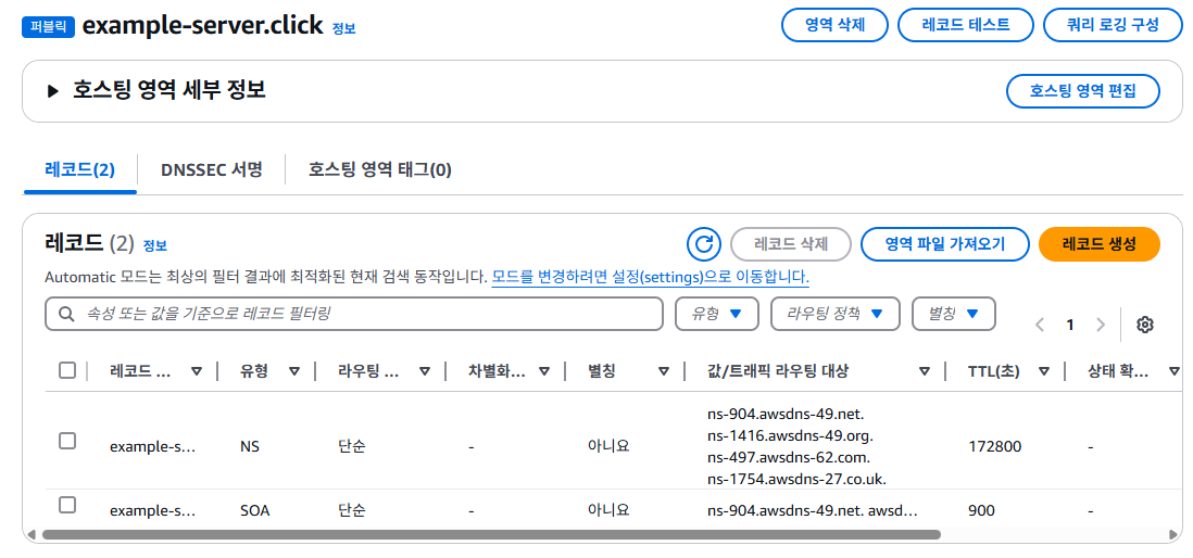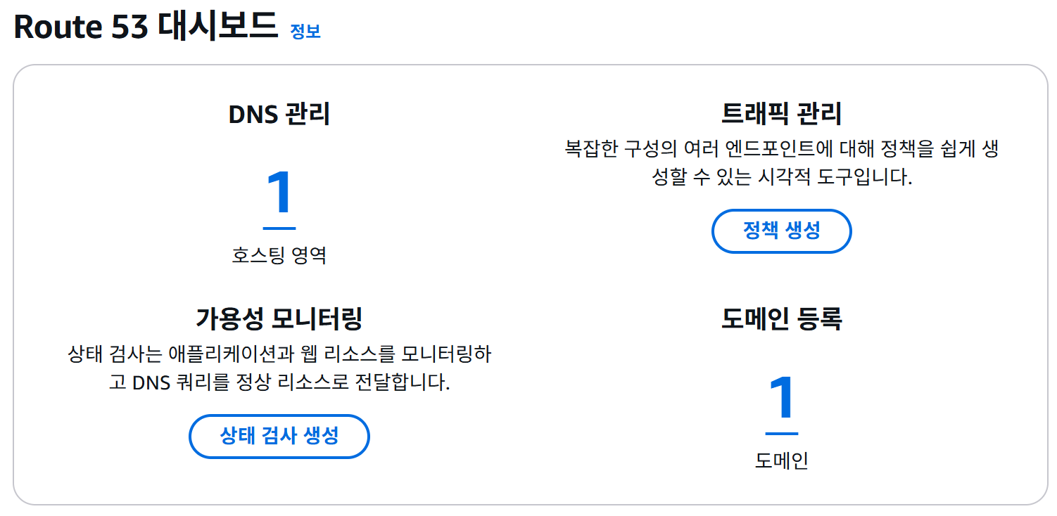 도메인 등록이 완료되면 Route 53 대시보드에 자동으로 호스팅 영역이 생성된다.