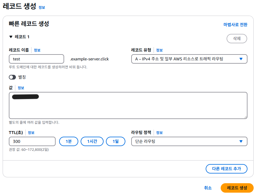 모든 입력을 마친 후 [레코드 생성]을 클릭하면 도메인과 EC2 서버가 연결된다.