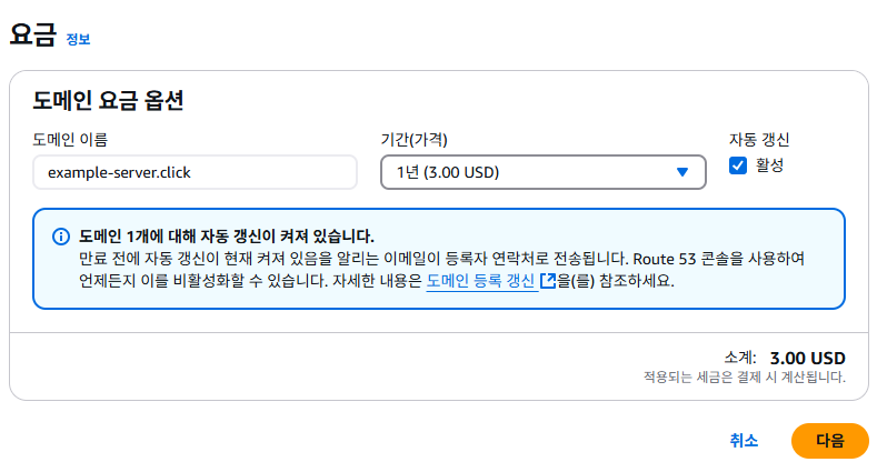 도메인 등록 옵션 및 자동 갱신 여부를 확인하고 [다음]을 클릭한다.