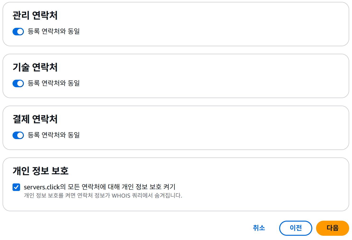 관리/기술/결제 연락처가 동일한 경우 체크한 후, 개인정보 보호 옵션을 활성화하고 [다음]을 클릭한다.