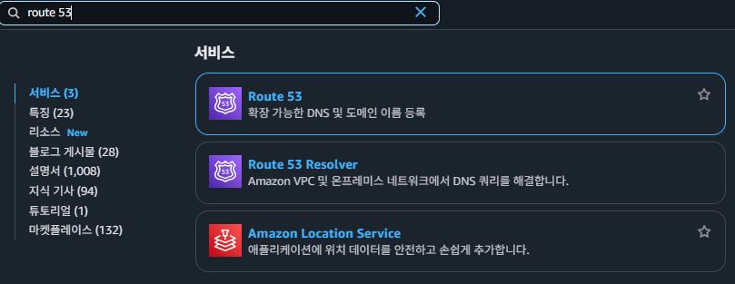 AWS 콘솔 상단의 검색창에 Route 53을 입력해 이동한다.