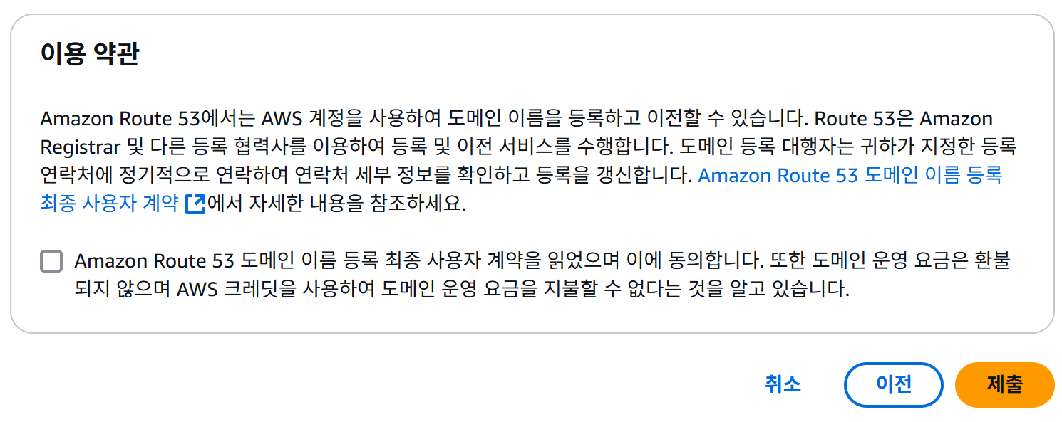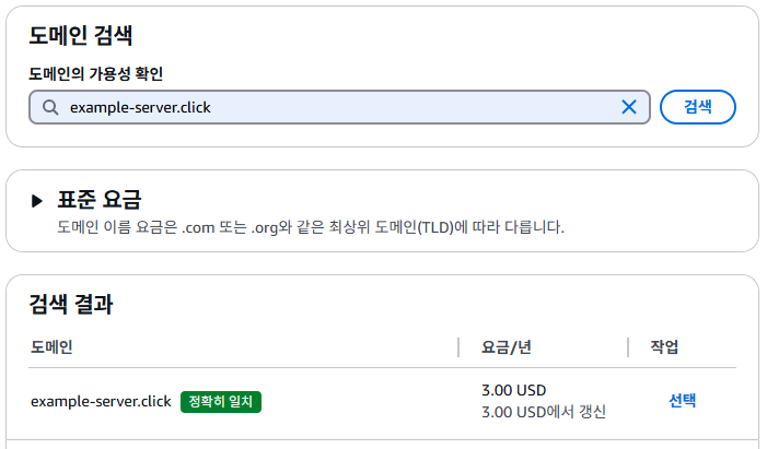 [도메인 등록] 버튼을 클릭하면, AWS Route 53에서 도메인을 직접 검색하고 구매할 수 있다.