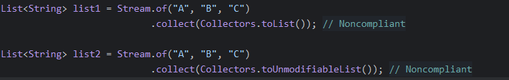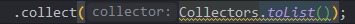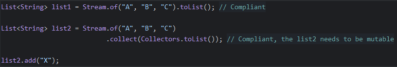 collect를 사용하여 스트림에 목록을 만들 때 .collect(Collectors.toList()) 가 실제로 변경 가능한 종류의 List 를 반환하는 반면 대부분의 경우 수정할 수없는 목록을 선호된다