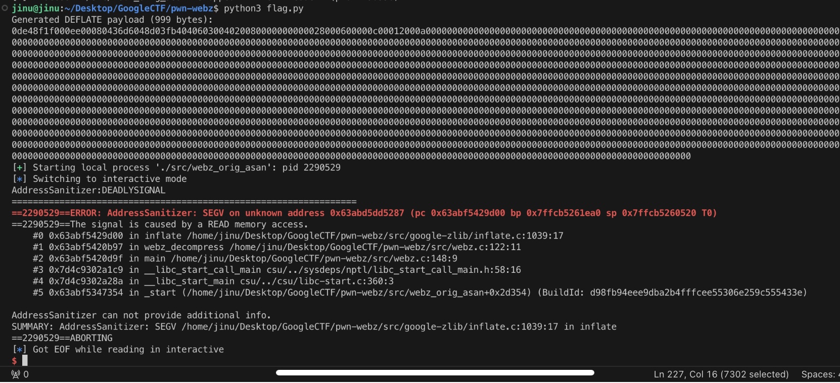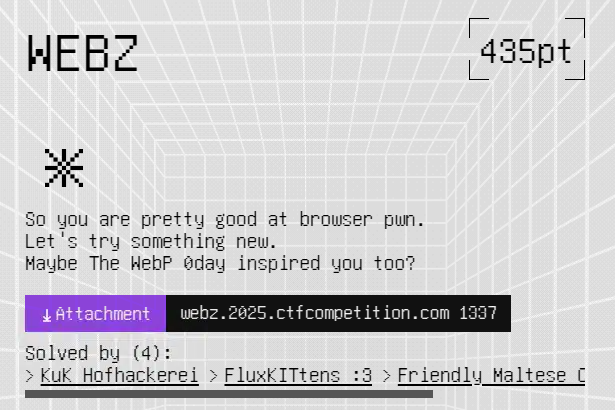 is a zlib exploitation challenge from Google CTF 2025. The Google-zlib implementation provided in the challenge is not upstream; it’s a version with an arbitrary patch applied. Whereas typical open‑source exploit challenges ship a patch that clearly introduces a vulnerability, webz
