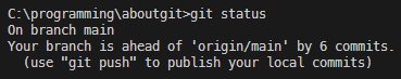 git status 를 쳐보면, Your branch is ahead of 'origin/main' by 6 commits.라고 뜬다. 즉, 로컬과 원격 레포의 내용이 다르다고 말하고 있다.