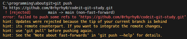 만약 --amend를 하기 전 내용으로 이미 push했다면, 다음과 같은 에러 메시지가 나올 것이다.