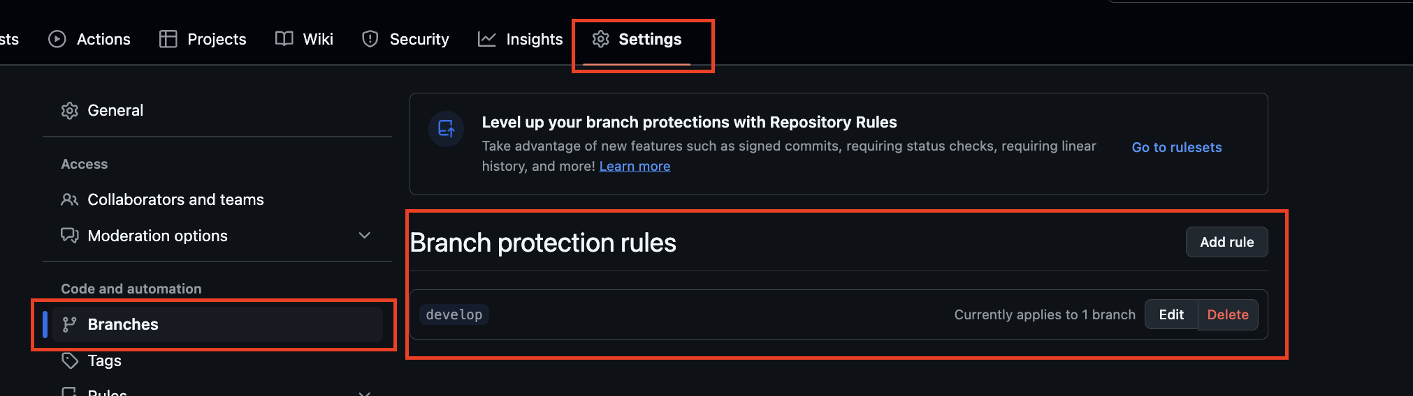 GitHub 리포지토리의 Settings > Branches에서 branch protection rules을 설정