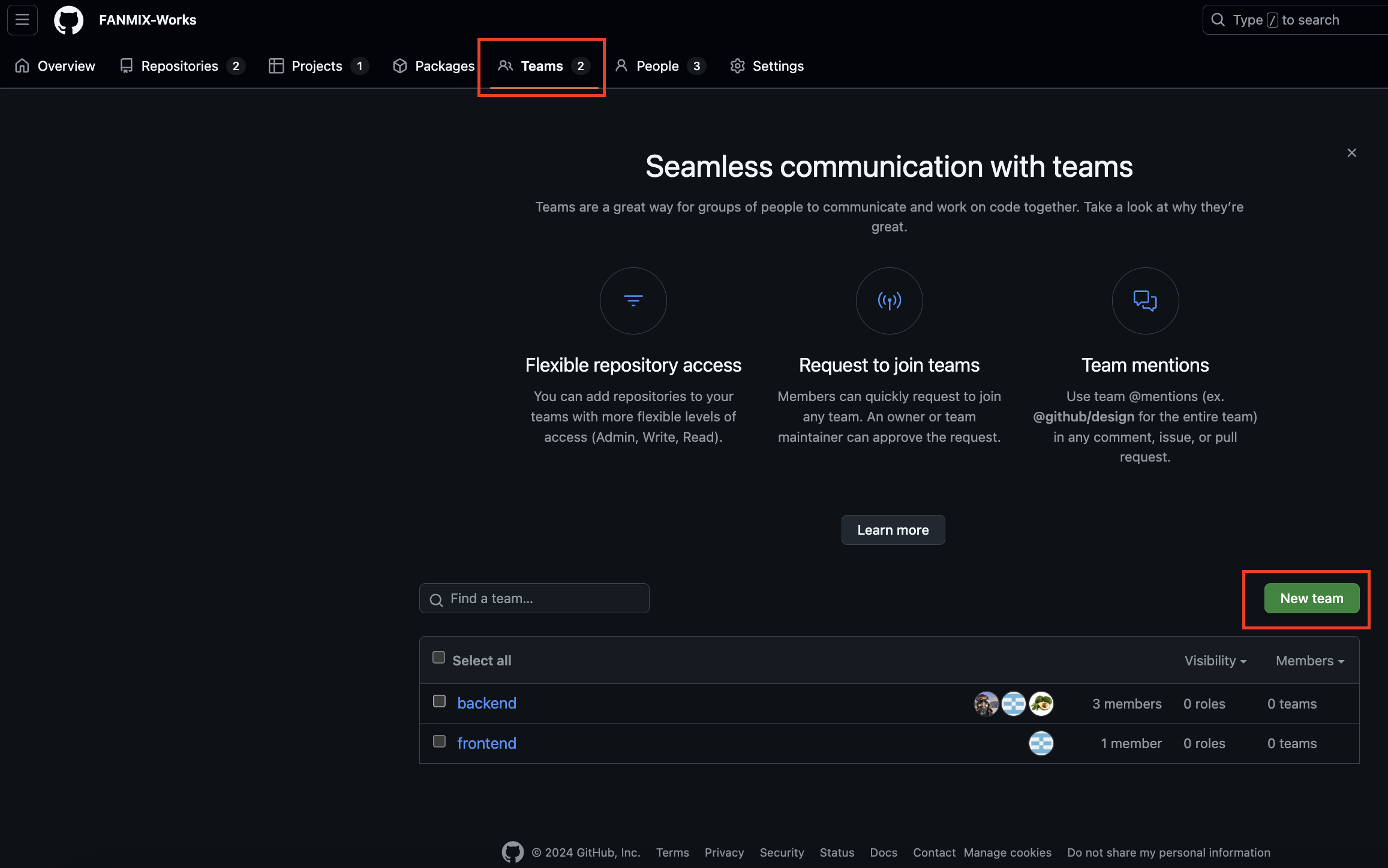 조직 설정에서 새로운 팀을 생성 (예: Frontend 팀).
