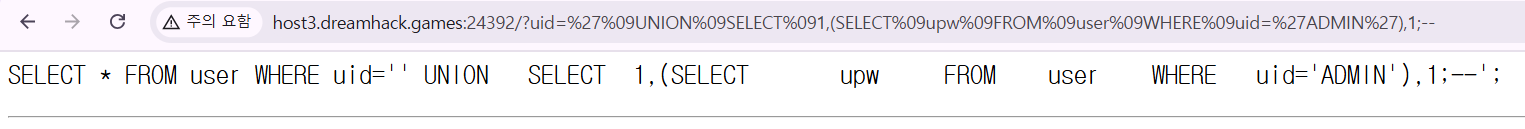 즉, uid 값은 쿼리의 ' 안에 들어가고, fetchone()으로 가져온 결과 중 result[1]만 출력된다. result[1]은 uid 필드이기 때문에, 우리가 직접 원하는 upw는 화면에 출력되지 않는다.