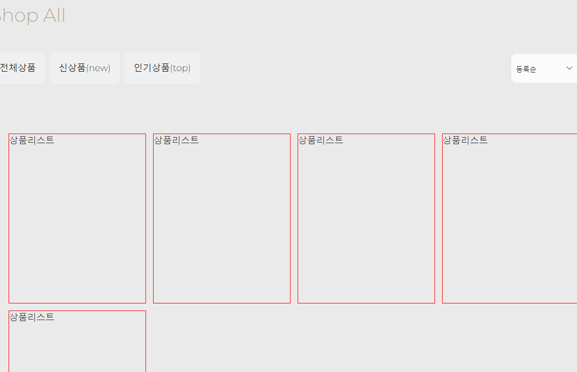 이후 Shop All 요소에는 width: 100%를 지정하여 한 줄 전체를 차지하도록 만들고, 그 다음 줄부터 왼쪽에는 카테고리 리스트, 오른쪽에는 상품 리스트(ProductList)가 배치되도록 구성했습니다.