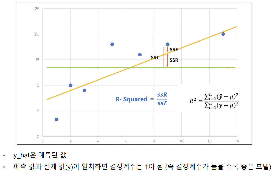 - 회귀모델에서 예측값이 참값을 얼마만큼 설명해주는지를 가르키는 지표, 회귀모델의 성과 지표