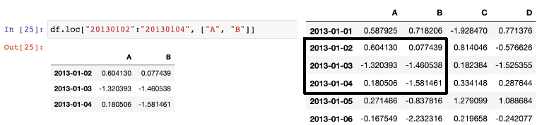 - df.loc[ 'n' : 'm', [ 'columnA', 'columnB' ] ], 문자 그대로 슬라이싱