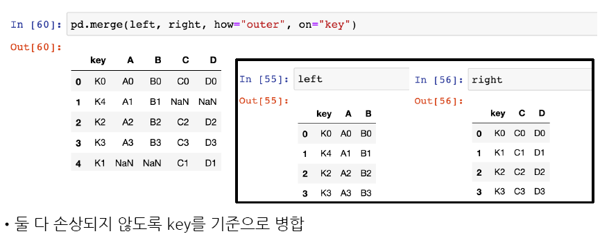 - merge 기준에 의한 값이 없다면 NaN값으로 표시