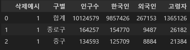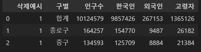 - 인덱스(행) 삭제 시 axis = 0, 컬럼(열) 삭제 시 axis = 1