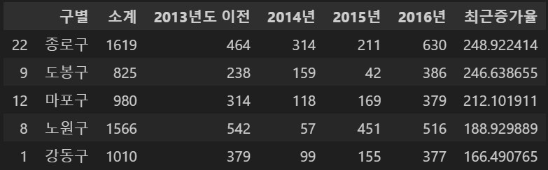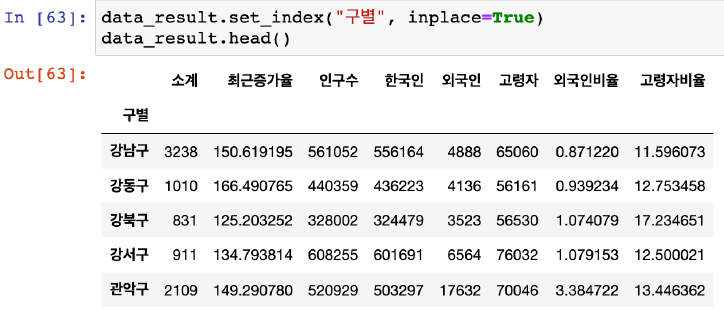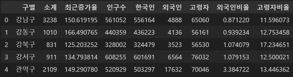 pop_seoul['외국인비율'] = pop_seoul['외국인']/pop_seoul['인구수'] * 100