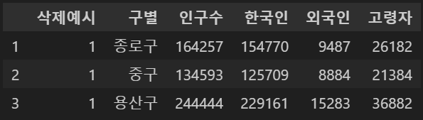- 다수의 칼럼 및 인덱스 삭제 : ['1', '2', '3']와 같이 리스트로 묶어주기