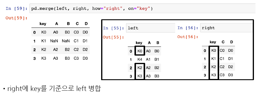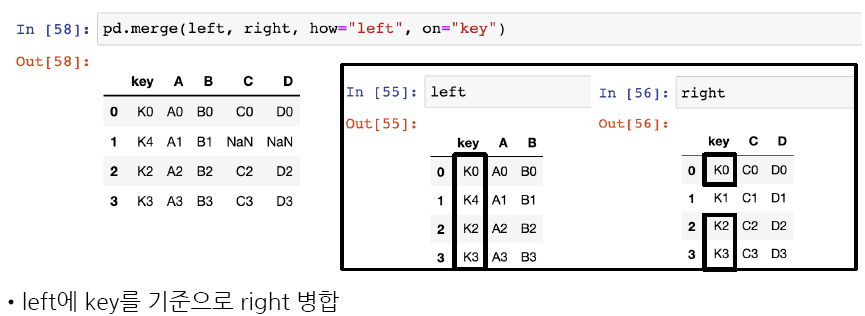 데이터프레임 병합, pd.merge(left, right, how, on ..)