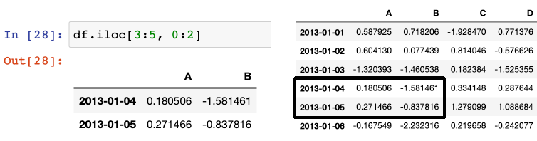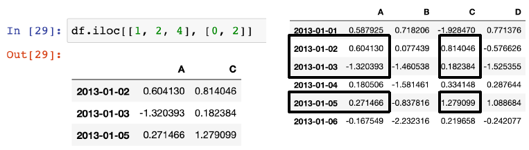 - df.iloc[ [ 1, 2, 4 ], [ 0, 2 ] ], 행, 열의 숫자를 리스트로 담아 슬라이싱