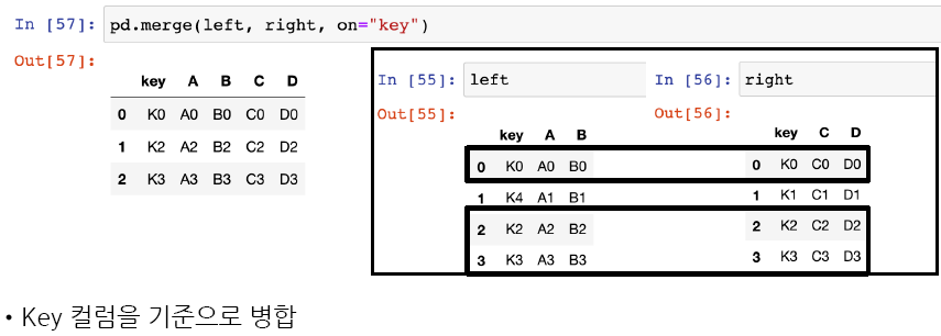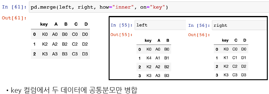 - how: 병합 방법을 지정하는 문자열로 일반적으로 사용되는 값으로는 'left', 'right', 'outer', 'inner' 등이 있으며 기본값은 'inner'