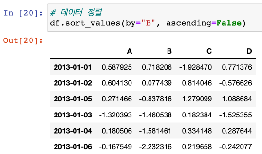- sort_values(by='정렬기준 column', ascending=False) , ascending=False : 내림차순(큰->작은)