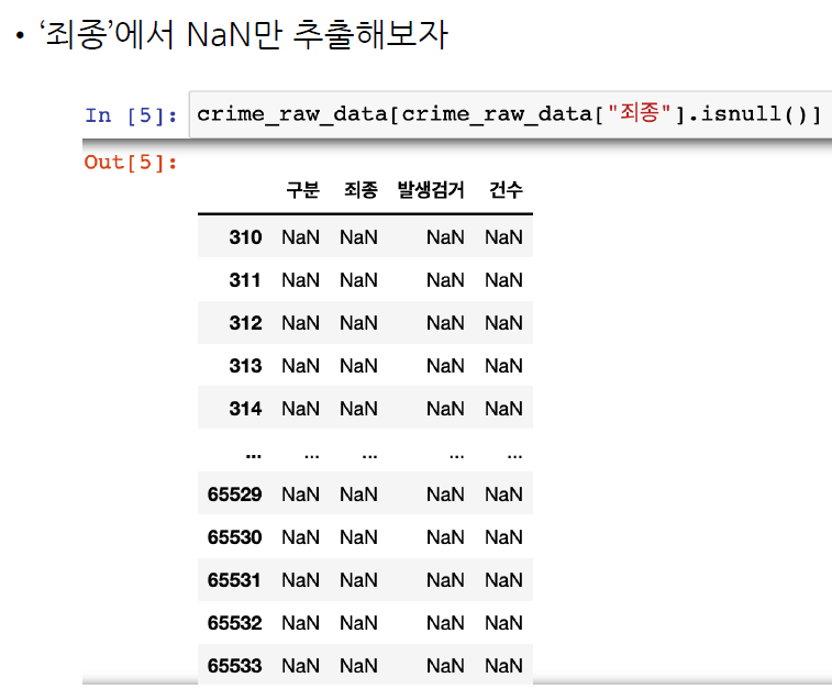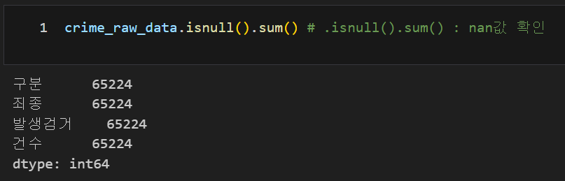 df[column name].isnull().sum() NaN값의 수 합계 확인