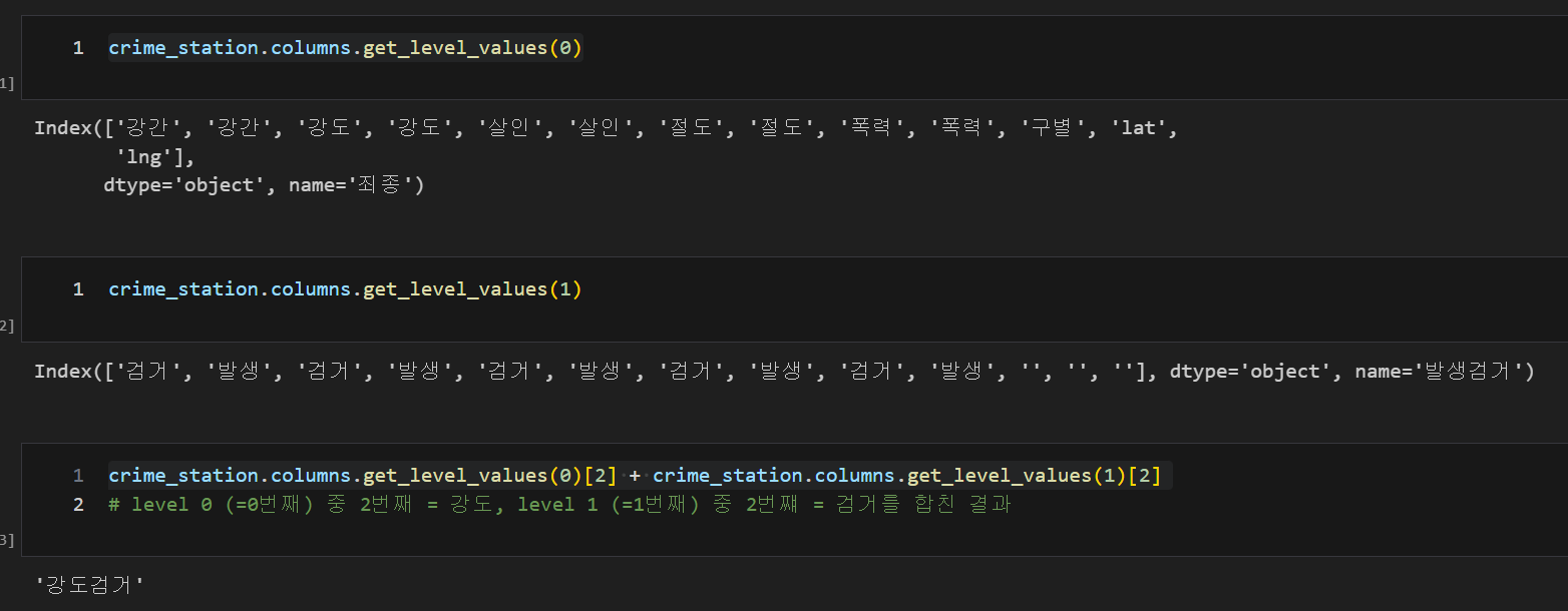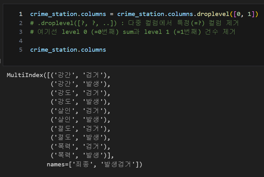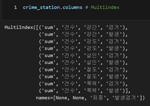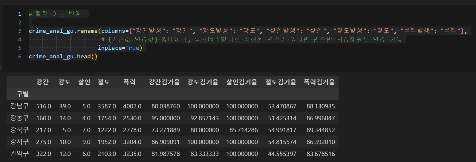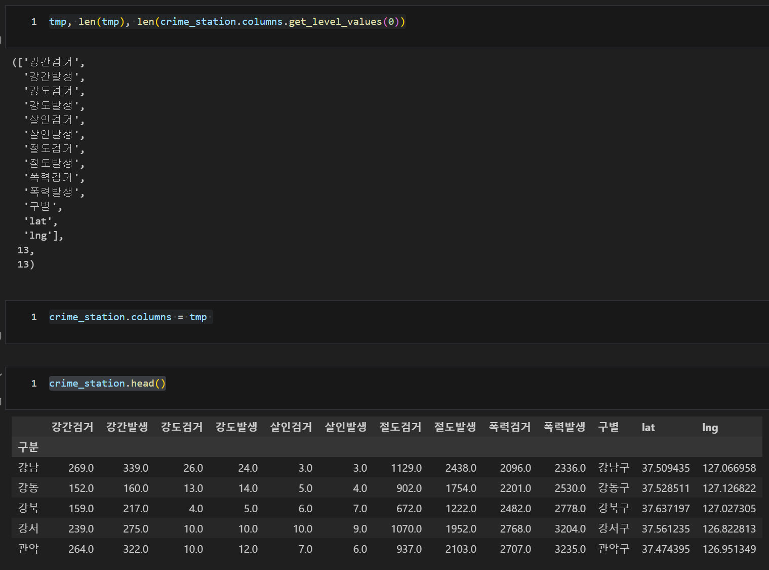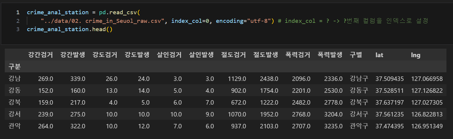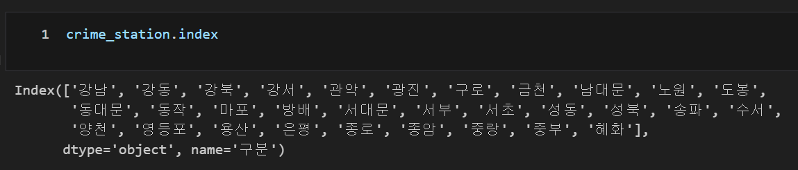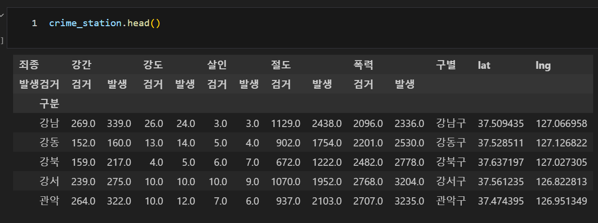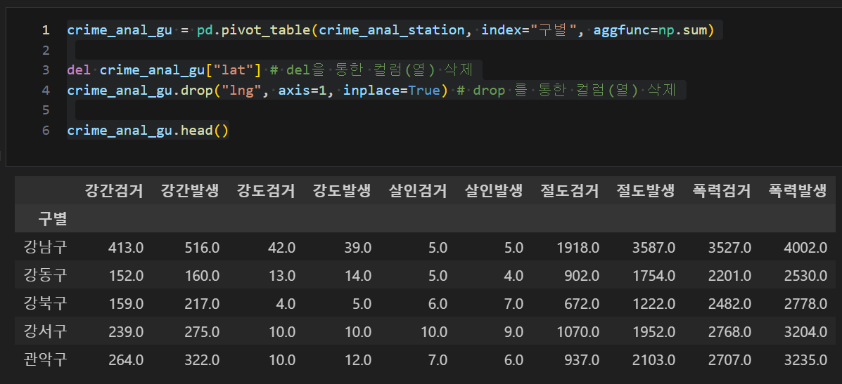 del crime_anal_gu["lat"] # del을 통한 컬럼(열) 삭제