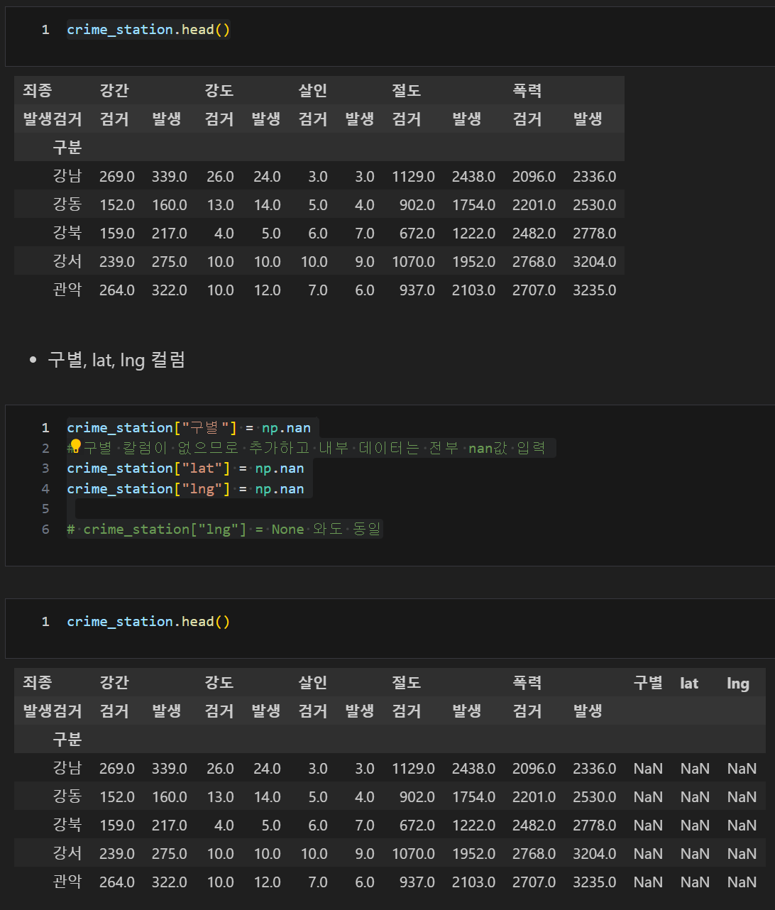 # 구별 칼럼이 없으므로 추가하고 내부 데이터는 전부 nan값 입력