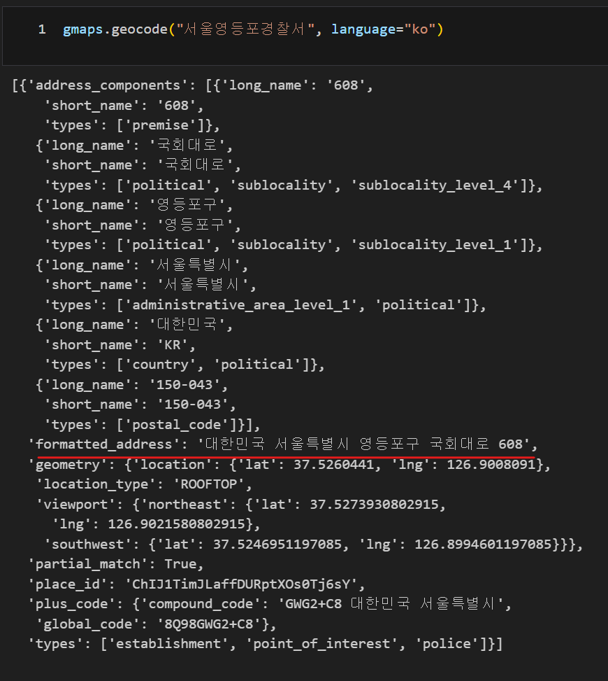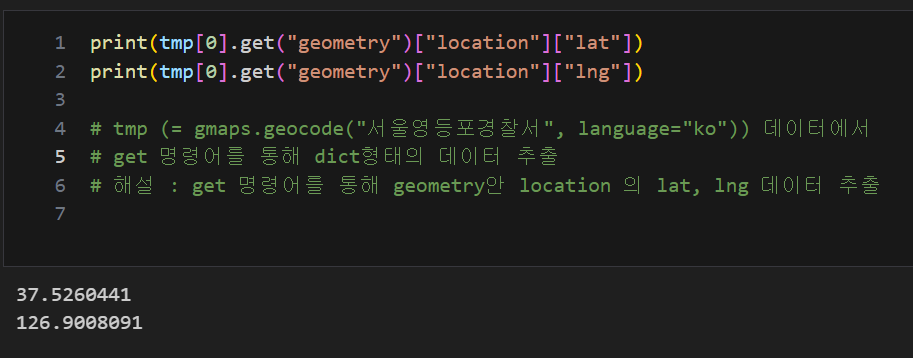 # tmp (= gmaps.geocode("서울영등포경찰서", language="ko")) 데이터에서