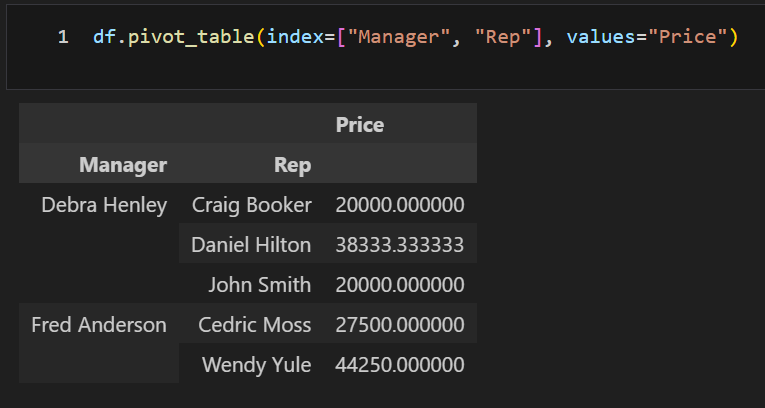 df.pivot_table(index=["Manager", "Rep"], values="Price")