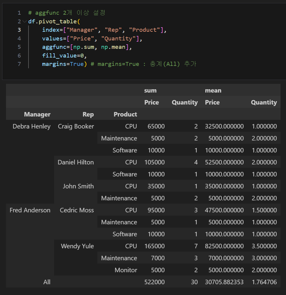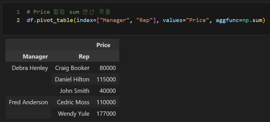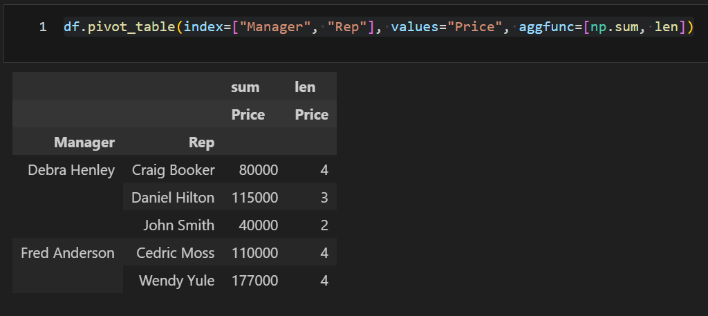 df.pivot_table(index=["Manager", "Rep"], values="Price", aggfunc=[np.sum, len])
