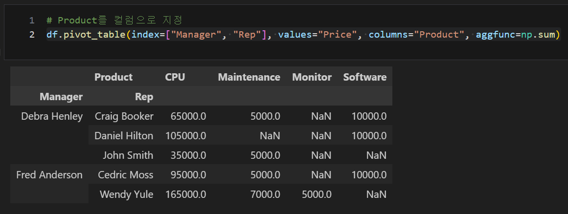 df.pivot_table(index=["Manager", "Rep"], values="Price", columns="Product", aggfunc=np.sum)
