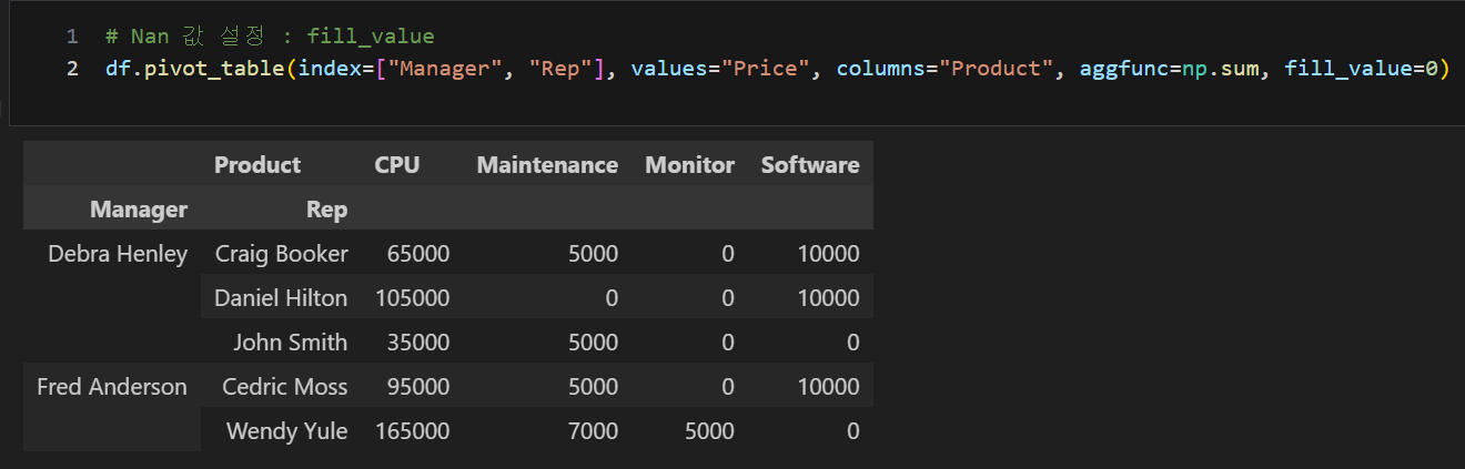 df.pivot_table(index=["Manager", "Rep"], values="Price", columns="Product", aggfunc=np.sum, fill_value=0)