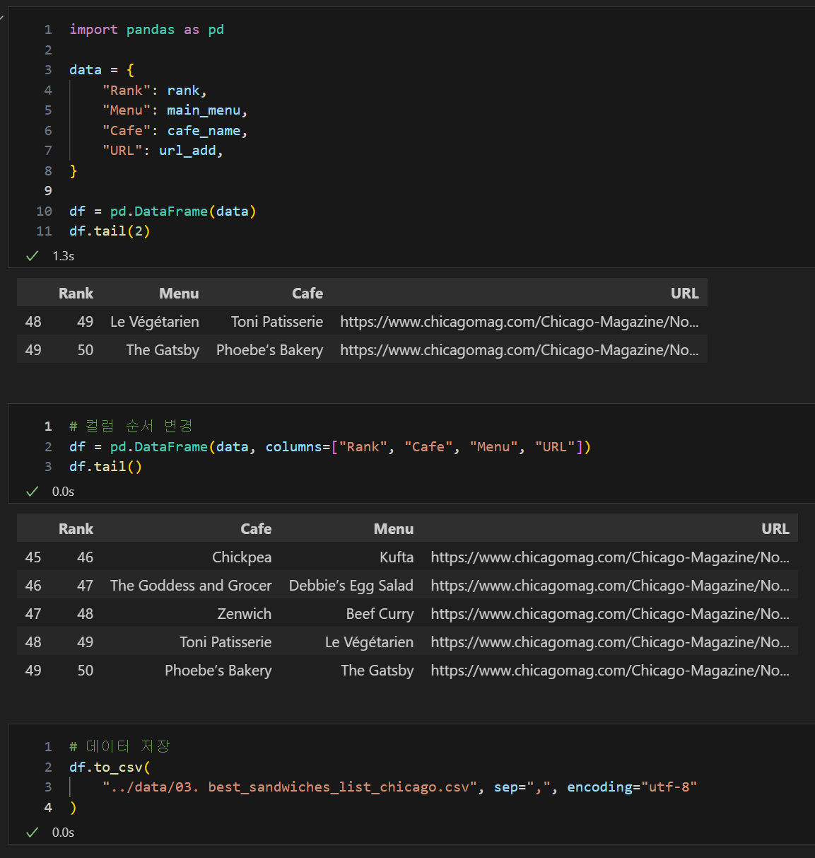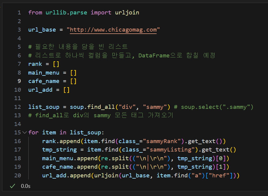 상대주소 및 절대주소 대응 후 for문을 통하여 원하는 값들을 리스트화하고 데이터 프레임 생성