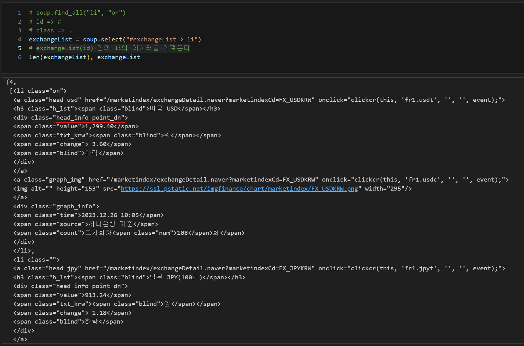 id인 exchangeList 를 이용하여 하위 값 가져오기, exchangeList(id) 안의 li의 데이터를 가져온다