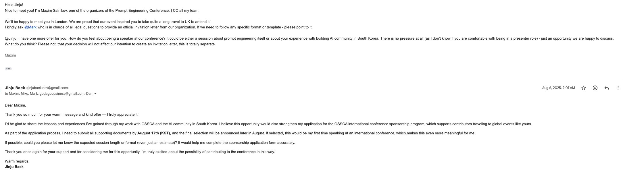 주최측에서 빠르게 비자레터를 작성해주셨지만 오픈소스 아카데미 측의 심사 결과가 나오려면 약 한 달이라는 시간이 걸려서 마음을 놓고 있었다.