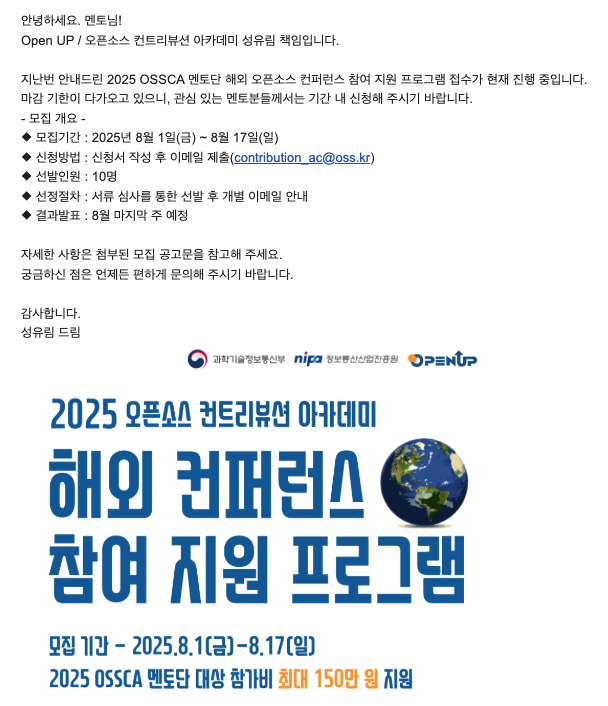 어느덧 3년째 함께 해오고있는 OSSCA에서 해외 컨퍼런스 참여 스폰서십 프로그램 공고 알림을 받았다.