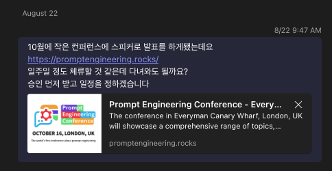 개발 컨퍼런스 가는 것을 너무 좋아하는 나는 바로 눈에 불을 켜고 Dev event라는 개발 컨퍼런스 일정을 모아놓은 페이지에서 프롬프트 엔지니어링 컨퍼런스를 발견했고, 내 자초지종을 설명한 뒤 초청장을 요청했다.