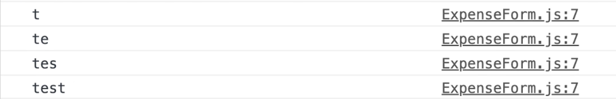 예상했던 console 결과값임을 알 수 있다. test를 타이핑하는 모든 keystrok에 반응하여 그 시점의 현재값들을 console에 출력한다.