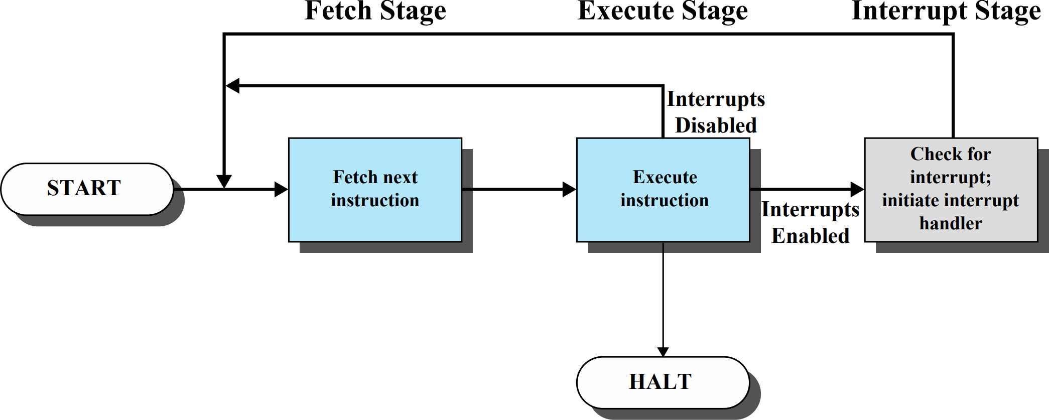 Fetch stage와 Execution stage를 건드리지 않는 대신 두 단계를 거친 후에 Interrupt stage를 거치게 된다. 사실 생각해볼때, 명령어를 읽어오고 수행하는 중간에 중단을 걸어야 한다면 그것을 구현할 하드웨어가 또 필요하다. 비용이 늘어난다! 따라서 하드웨어적으로 해결할 수 있는 방법은 최소화하고 소프트웨어적으로 해결하도록 발전하게 되었다.