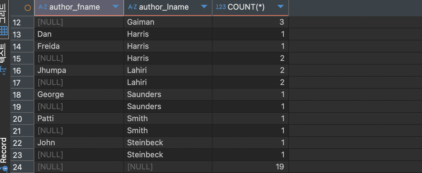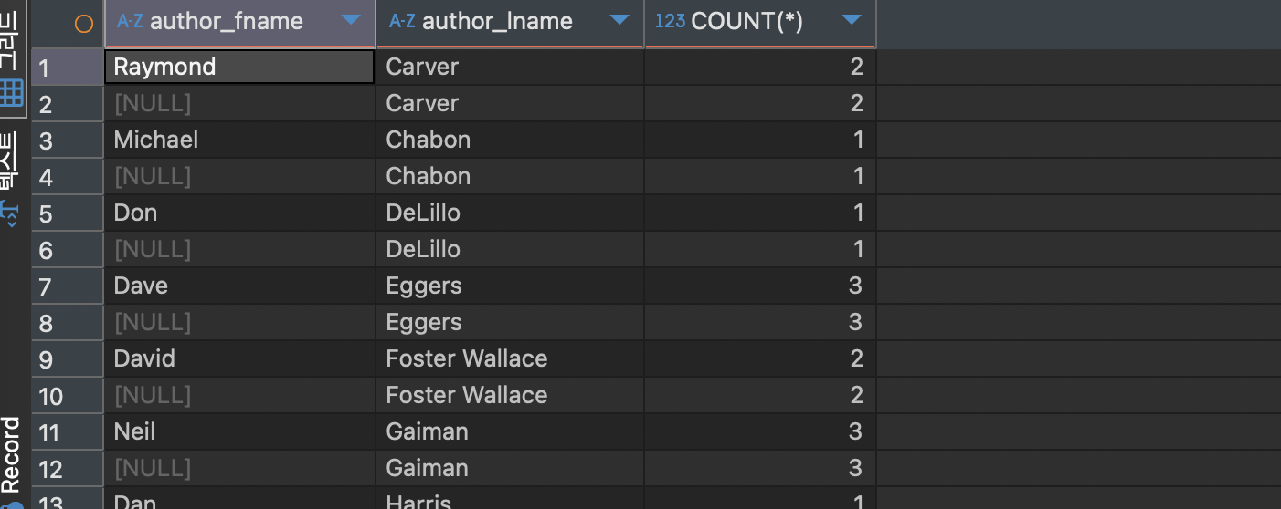 아래에 보면 author_lname 이 Harris인 그룹이 두 개 생긴것을 확인할 수 있습니다. 왜냐하면 먼저 author_lname 로 먼저 그룹화를 한 뒤 author_fname 로 그룹화를 했기 때문입니다. 그래야만 Harris인 그룹이 두 개가 나옵니다.