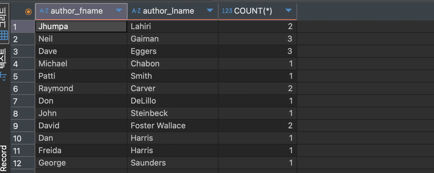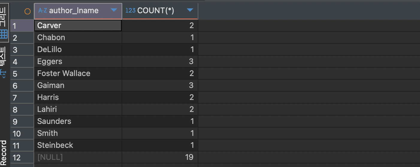 위 코드는 author_lname으로 묶은 뒤 author_lname와 데이터 수를 출력하라는 의미입니다.