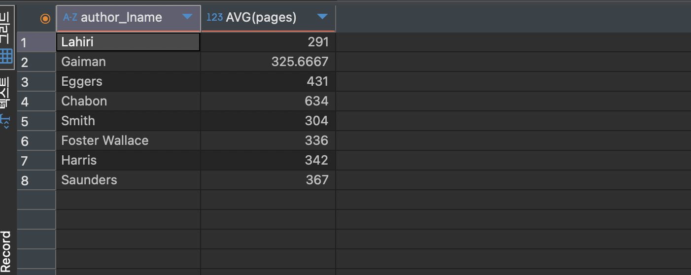 위 결과를 보면 author_lname 으로 묶인 뒤 데이터의 수를 출력된 것을 확인할 수 있습니다.