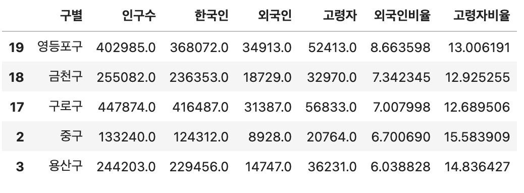 위 표를 보면 외국인의 절대적인 숫자는 구로구가 금천구보다 많지만 비율은 금천구가 구로구보다 많다는 것을 알 수 있습니다.