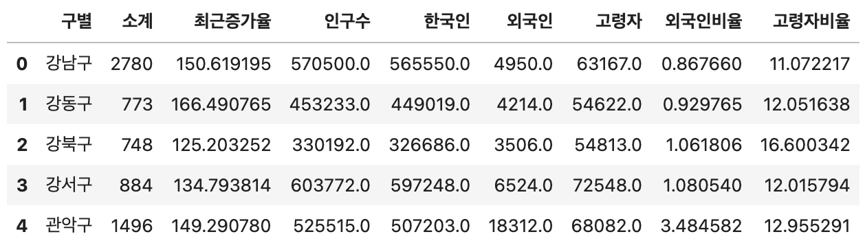 data_result = pd.merge(df_cctv, df_pop_seoul, on='구별')